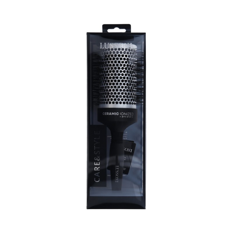 The round styling detangling hairbrush has a diameter of 65MM that will work great in any hair salon. Lussoni detangling hairbrushes stand out from other accessories because of their elegant appearance and because of their added properties. Its round ceramic silver coated body makes it possible to style and lift hair from the roots. The notched bristles grip has antistatic and ionizing properties that reduce styling time to a minimum.