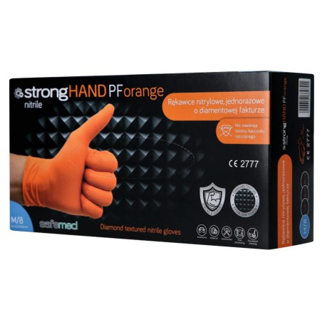 SAFEMED Strong Hand PF Orange are exceptionally strong, disposable nitrile gloves designed for tasks requiring the highest levels of resistance and a secure grip. Their thicker construction and special diamond texture ensure maximum durability, safety, and stability even in challenging conditions. They are an ideal choice for industries such as automotive, mechanics, industrial, logistics, and food service, where hands are exposed to intense contact with chemicals, oils, and grease.
