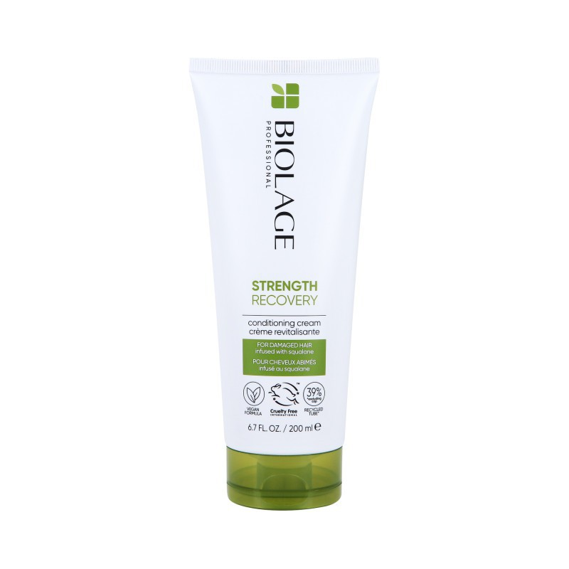 Strength Conditioning Cream Recovery Conditioning Cream by Biolage instantly cares for damaged hair. The vegan formula with 97% ingredients of natural origin provides intensive nourishment while reducing breakage. This rinse-out conditioner with a creamy consistency is specially designed for damaged hair, but can be used on all hair types, including colored hair. In just 3 minutes, hair is strengthened and moisturized, giving it a softer, shinier and healthier look. The formula is vegan, free from animal ingredients, sulfate-free and 99% biodegradable. Contains squalane , a natural emollient that nourishes and repairs hair without leaving a greasy residue. Split ends are regenerated and breakage is minimized.