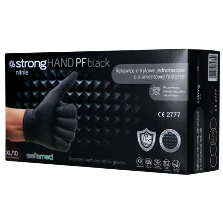 SAFEMED Strong Hand PF Black zijn uitzonderlijk sterke nitril handschoenen voor eenmalig gebruik, ontworpen voor taken die de hoogste weerstand en een stevige greep vereisen. Hun dikkere constructie en speciale diamantstructuur garanderen maximale duurzaamheid, veiligheid en stabiliteit, zelfs in moeilijke omstandigheden. Ze zijn de ideale keuze voor sectoren zoals auto's, mechanica, industrie, logistiek en voedingsdiensten, waar handen worden blootgesteld aan intensief contact met chemicaliën, oliën en vetten.
