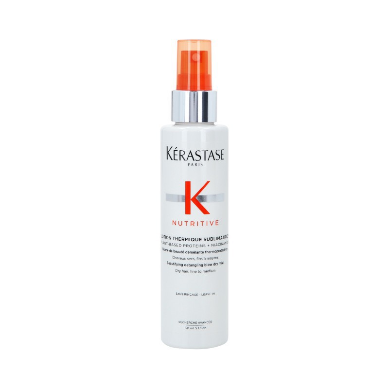 Als leave-in product helpt Nutritive Lotion Thermique Sublimatrice normaal en droog haar beschermen en revitaliseren. Door het haar te hydrateren, geeft het stevigheid en elasticiteit, waardoor pluizig haar tot een minimum wordt beperkt. De lichte formule, verrijkt met plantaardige proteïnen en niacinamide, vergemakkelijkt het stylen en beschermt het haar tegen temperaturen tot 230°C. Het product zorgt zonder spoelen voor onmiddellijke zachtheid en stralende glans. Deze lichte, melkachtige essence beschermt het haar niet alleen tegen hoge temperaturen, maar vergemakkelijkt ook het stylen en kammen. De productverpakking is gemaakt van 95% gerecycled plastic.
