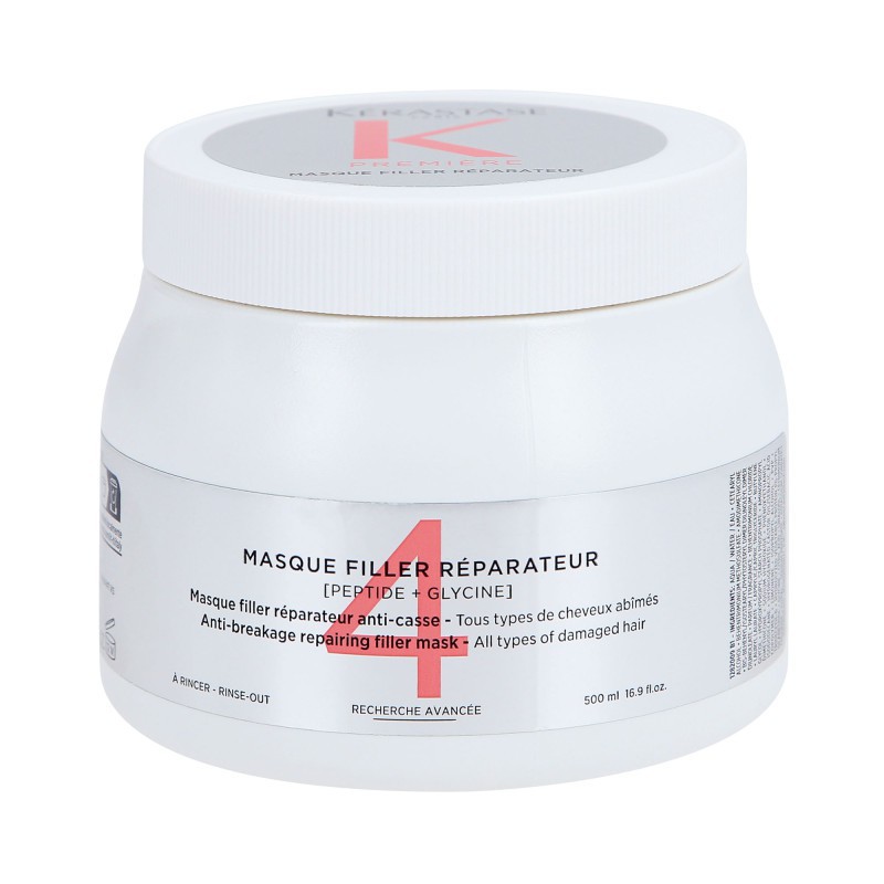KÉRASTASE PREMIERE FILLER REPARATEUR 4 is een herstellend en herstellend haarmasker, dat werd gecreëerd voor een diepe regeneratie en versterking van beschadigd en verzwakt haar. De geavanceerde formule is gebaseerd op krachtige actieve ingrediënten: peptiden die de haarstructuur intensief heropbouwen en versterken. Glycerine, die diep hydrateert en het haar beschermt tegen uitdrogen, en citroenzuur, dat de natuurlijke pH-waarde van het haar helpt herstellen, waardoor het een gezonde glans en gladheid krijgt.
