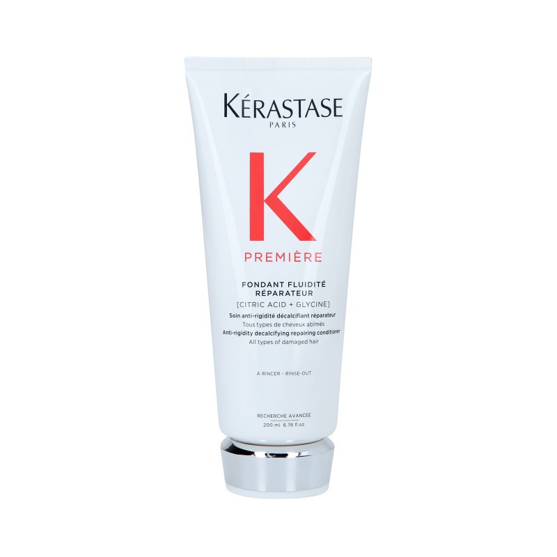 Herstellende, ontkalkende en ontwarrende conditioner voor beschadigd haar. Verwijdert overtollig calcium dat gevoelig haar aantast en herstelt schade met een dubbele werking, waardoor zachtheid, vocht en kracht worden hersteld. De eerste Kérastase ontkalkende en herstellende conditioner voor alle soorten beschadigd haar. Herstelt de oorspronkelijke elasticiteit van het haar en versterkt de vezels. Herstelt onmiddellijk de vochtbalans en vloeibaarheid van behandeld of gebleekt haar. Zodra het haar beschadigd is, hoopt calcium zich op, waardoor de haarschubben en de cortex verder verzwakken. Kérastase Fondant Fluidity Réparateur bestrijdt overtollig calcium door het haar eerst te ontkalken en vervolgens te herstellen. Kérastase Première Fondant Fluidity Réparateur hult het haar in een lichte, gelatineachtige consistentie en herstelt de sterkte en weerstand. Het haar blijft ongelooflijk zacht, glad en flexibel. Tube gemaakt van 45% gerecycled plastic.