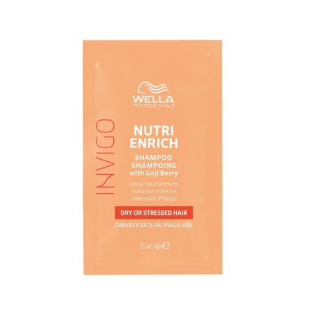 Wella shampoo Professionals Invigo Nutri-Enrich is een intensief voedend product dat speciaal is gecreëerd voor de verzorging van droog, dof en verzwakt haar. Het reinigt de hoofdhuid en lokken op milde maar effectieve wijze en voorziet ze tegelijkertijd van essentiële voedingsstoffen. Bevat het Nutri - Enrich -Blend complex, dat oliezuur, panthenol, gojibessen en vitamine E combineert. Deze ingrediënten voorzien het haar van waardevolle mineralen, peptiden en vitaminen, waardoor het intensief gehydrateerd, zacht en vol glans wordt. Het kleine formaat van 15 ml maakt de shampoo ideaal voor op reis of als proefmonster.
